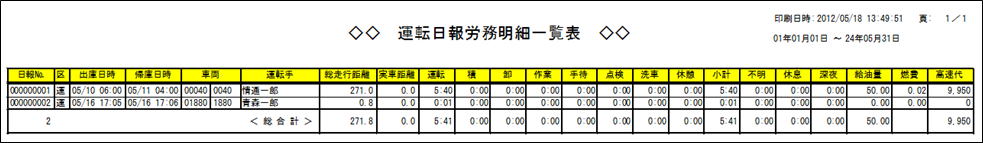 運転日報を登録することで売上や経費のデータと合わせて車両や人別の詳細な収支の把握ができます。 <運転日報入力> 運行に関わる経費情報も入力できます。 登録したデータは一覧表で印刷できます。 <運転日報労務明細一覧表> 売上データと合わせることで、輸送実績報告書の印刷もできます。